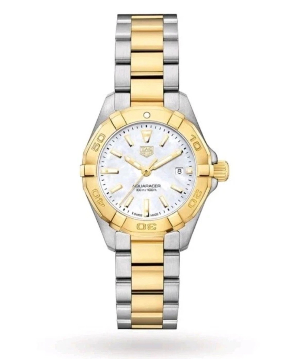 Discover the Tag Heuer Ladies Aquaracer WBD1420.BB0321 – Swiss-made elegance with stainless steel and gold bezel, mother of pearl dial, and Swiss quartz precision. Brand new and unused.