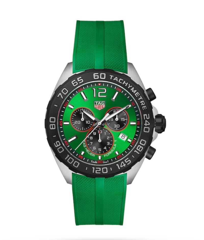 Discover the Tag Heuer Formula 1 CAZ101AP.FT8056 Men’s Watch – Swiss-made, green dial, rubber strap, tachymeter bezel, 13-jewel quartz movement, water-resistant, brand new and unused.